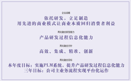 在信息化條件下,兩化融合是企業(yè)獲得可持續(xù)競爭優(yōu)勢的必由之路,是提高企業(yè)經濟效益的有效手段,關系到企業(yè)的研發(fā)設計高效管控能力、生產過程管控能力以及品牌服務全生命周期管控能力,涉及到企業(yè)管理和運營的方方面面。