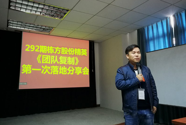 2017年11月23日,棟方股份精英《團(tuán)隊(duì)復(fù)制》第一次落地分享會(huì)在公司員工培訓(xùn)室舉行,與會(huì)人員除公司邱副總經(jīng)理、黃副總經(jīng)理、人事行政中心胡總監(jiān)及各精英團(tuán)隊(duì)負(fù)責(zé)人之外,還有幸邀請(qǐng)到聚成金牌講師李經(jīng)理一行蒞臨指導(dǎo)。